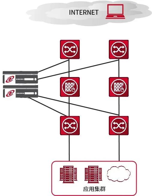 在上图的组网结构中,我们可以直观看到,k8凯发通明湖应用交付控制器设备可以很容易的接入在现有网络环境中,无需对原有网络配置做任何改动,只需在k8凯发通明湖应用交付控制器设备与核心交换机间配置相应的端口、VLAN及IP地址就可以完成设备互连,即可实现相关负载均衡技术,同时可以在接入交换机或核心交换机上对服务器进行横向扩展。
